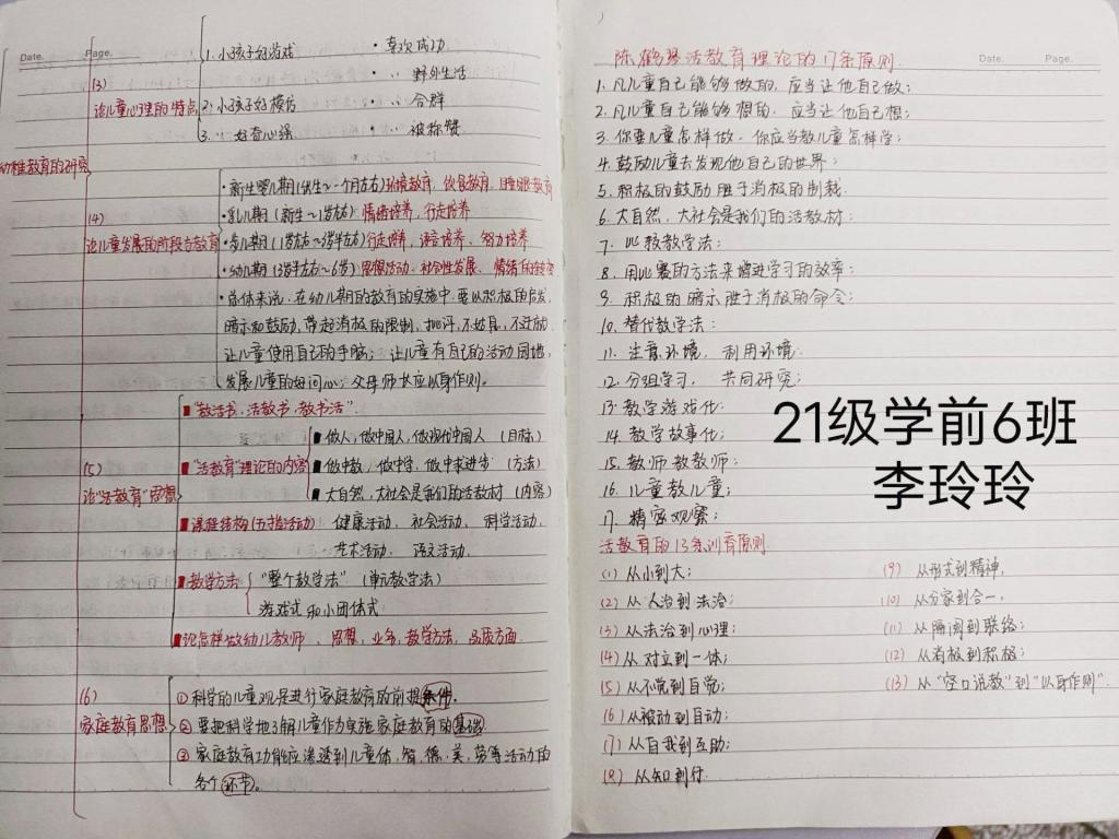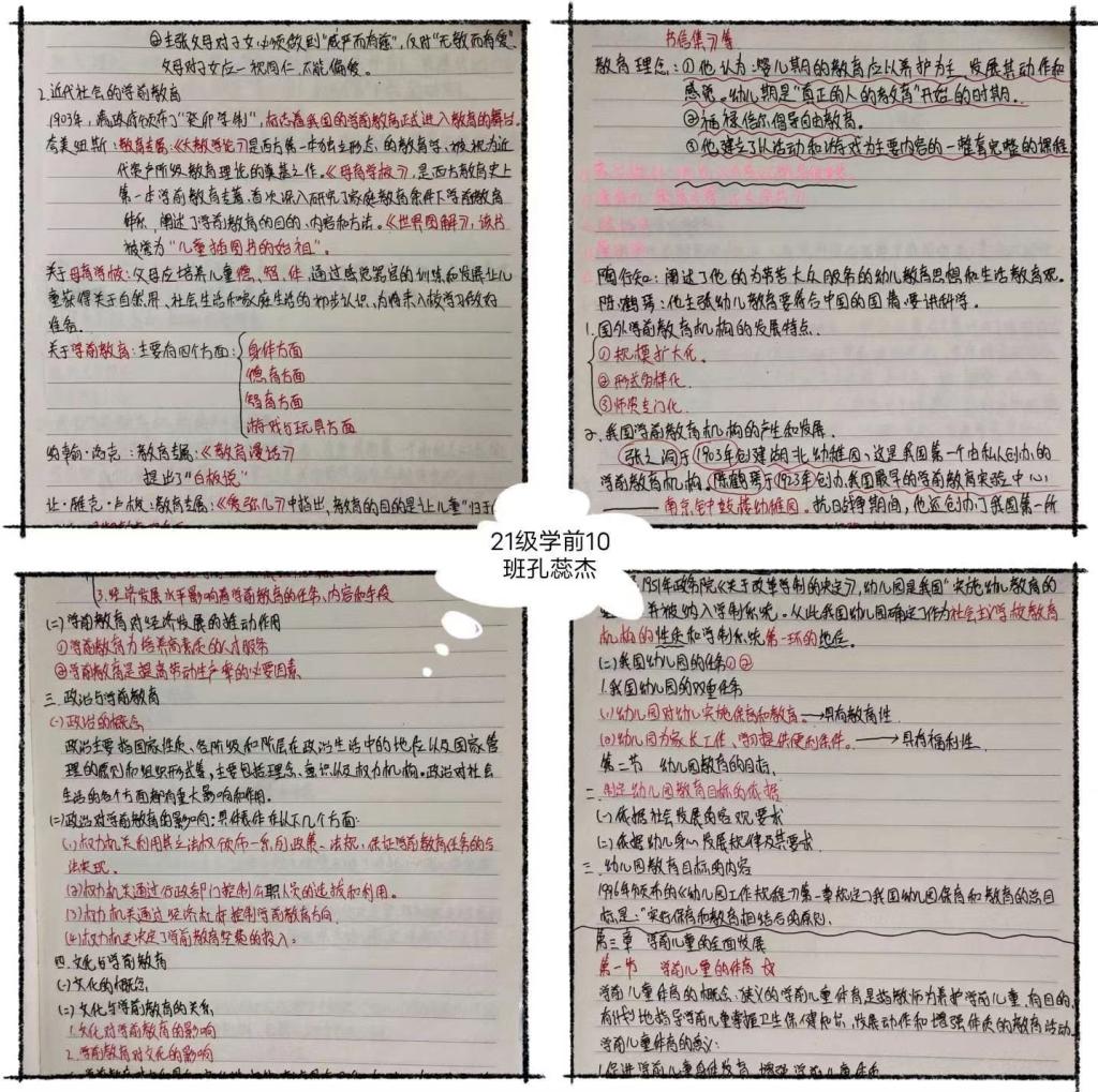 本次“最美笔记”评选活动得到公司各班的大力支持和广泛动员,经各班选拔推荐,收到包括学前教育专业、早期教育专业的作品合计35份,科目涵盖《学前教育学》《学前儿童发展心理学》《幼儿园课程》《大学英语》《乐理视唱》和《计算机基础》等多门课程,笔记内容充实、简洁工整,既有思路明确重点突出的知识点梳理,又有环环相扣的思维导图,多形式地展现了不同学科专业的独特风采,充分展示了公司学子良好的学习习惯。同学们根据投稿笔记的内容结构、条理逻辑、形式创新和实用程度等标准进行评定,最终评选出一、二、三等奖共8份最美笔记、10份优秀笔记。