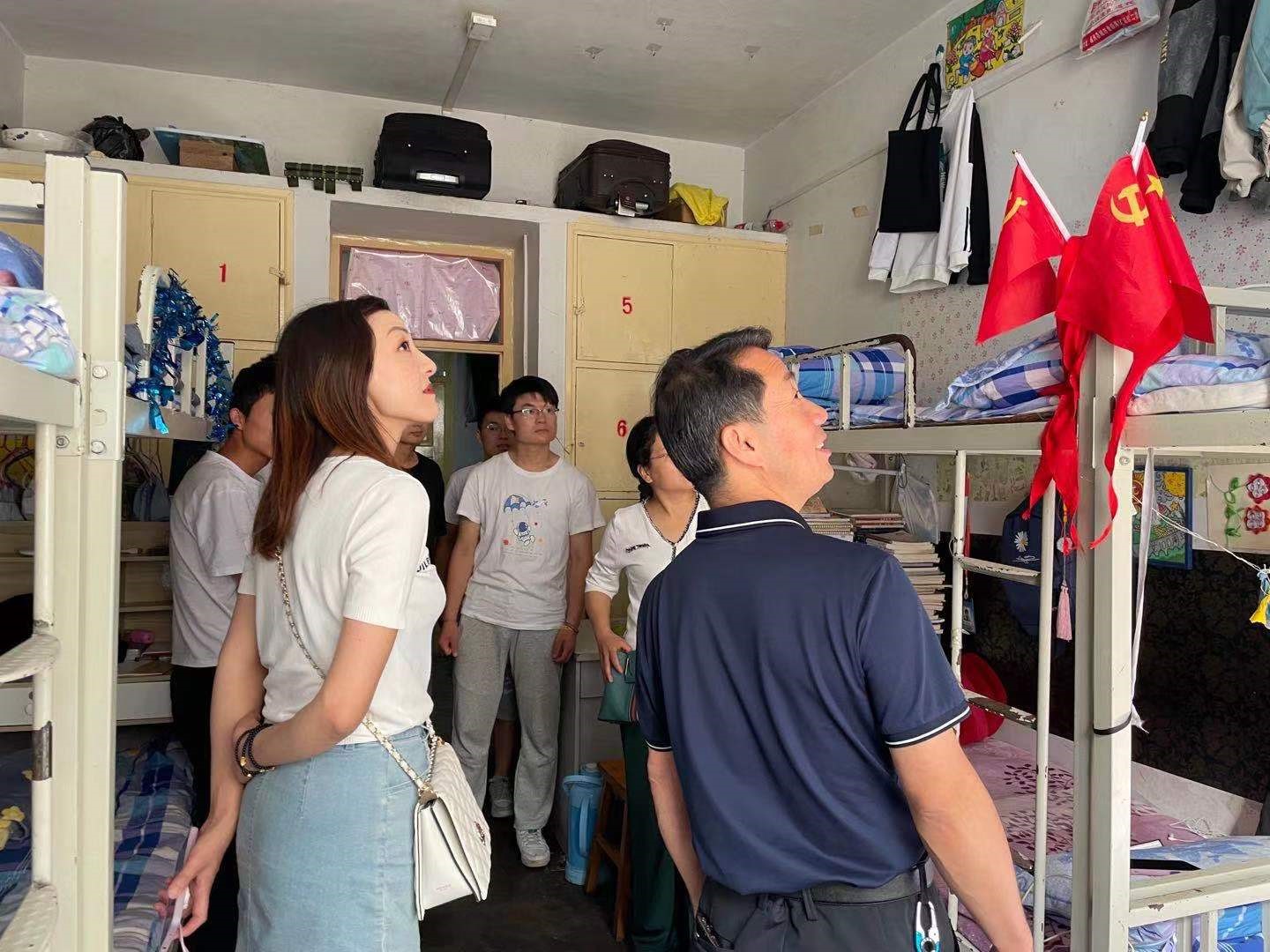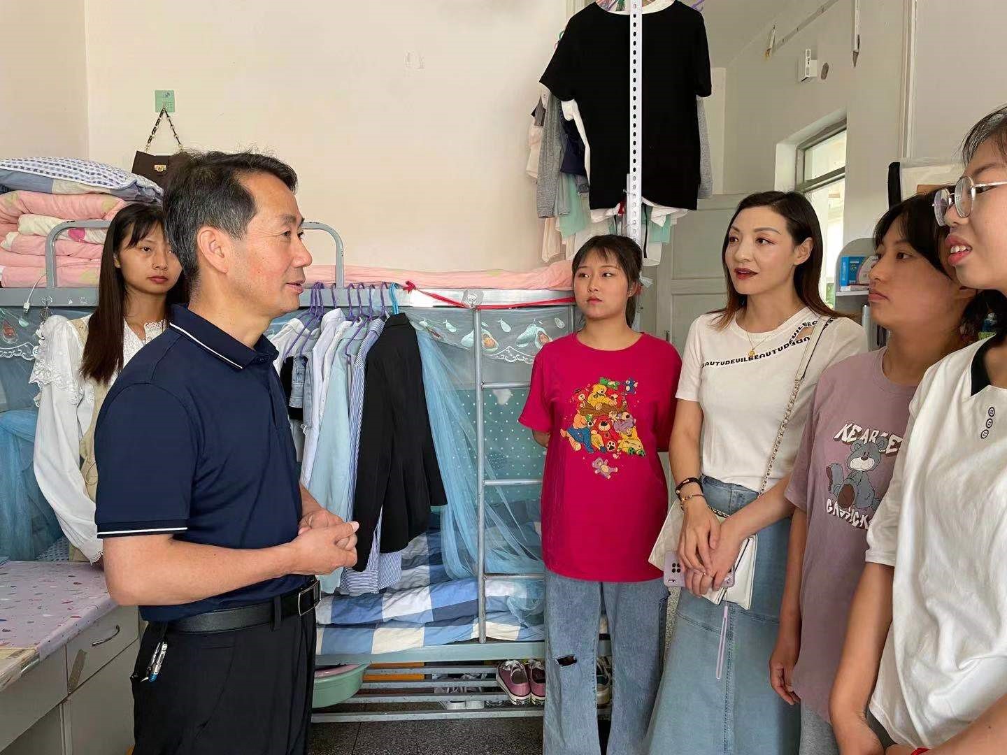 2021年7月3日下午,公司副董事长张建辉在学前教育公司党总支书记李霞、辅导员马妍丽的陪同下走访了suncitygroup太阳新城北校区男生2号公寓115、117和南校区女生3号公寓541、539宿舍,看望联系员工,了解同学们的生活、学习状况及面临的困难。