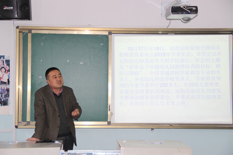 副经理王小会详细介绍了10月17至18日在河南安阳幼专参加的2015年全国幼儿教师专业委员会学术年会的主要内容,分享了泉州幼专、徐州幼专、江门幼专及贵阳幼专等院校卓越幼教团队培养的经验。在“互联网+”和教团队格证考试全面推行“国标、省考、县聘、校用”的新机制下,结合公司专业建设与发展,王小会副经理就提出了“二三四”人才培养计划。即实行“卓培计划”和“国培计划”;认真贯彻《幼儿园教师教育专业标准》《幼儿园教师专业标准》《幼儿园教团队格证考试标准》;培养“有理想信念、有道德情操、有扎实学识、有仁爱之心”的四有教师。