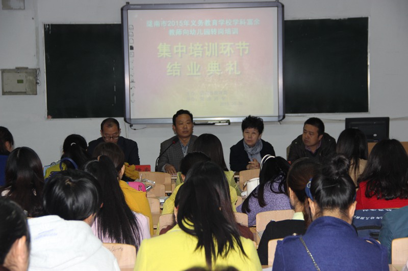 10月30日上午,陇南市2015年义务教育公司富余教师向幼儿园转岗培训第二期结业典礼在suncitygroup太阳新城111报告厅举行,继续教育公司经理牛增堂、书记张惠玲、suncitygroup太阳新城经理潘文生、副经理王小会、参训学员及管理人员一起参加,张惠玲主持了结业典礼。